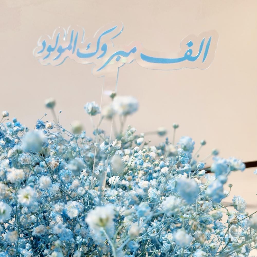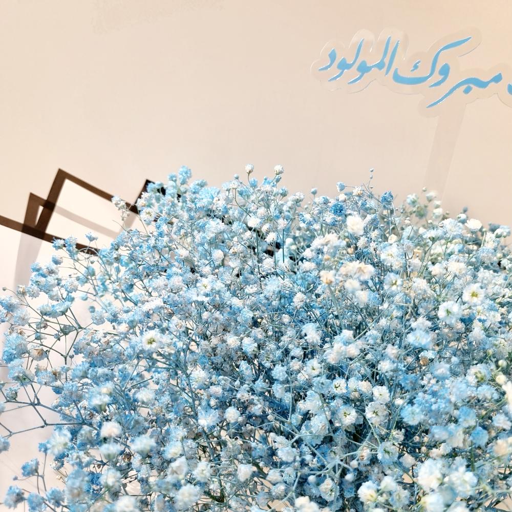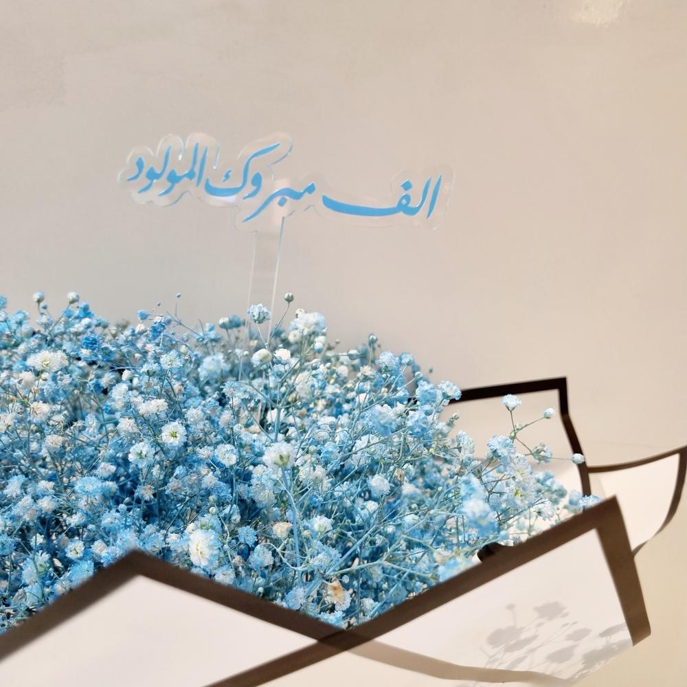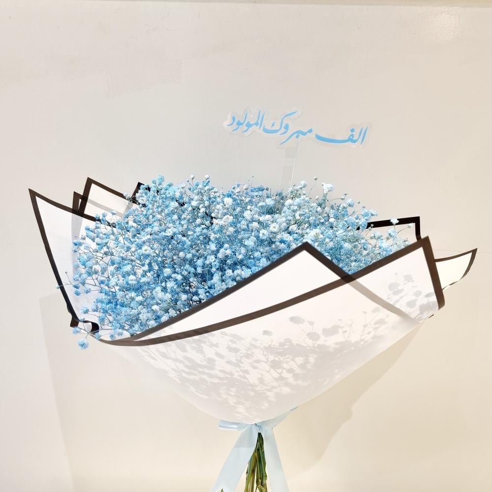 الهدية تزينها أغصان الجبسوفيلا الزرقاء، مزودة بتغريسة "ألف مبروك المولود"، وتُقدَّم الباقة بتغليف أبيض أنيق.